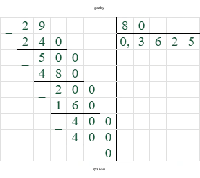в) Чтобы перевести дробь $\frac{29}{80}$ в десятичную, разделим 29 на 80: