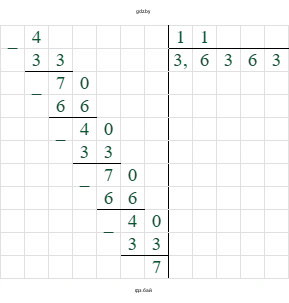 $4 \div 11 = 0.363636... = 0.(36)$