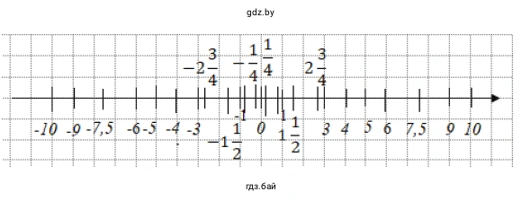 Для выполнения этой части задания начертим координатную прямую и отметим на ней все числа из заполненной таблицы. Список всех чисел для отметки на прямой: $0, \pm\frac{1}{4}, \pm\frac{3}{4}, \pm1, \pm1\frac{1}{2}, \pm2\frac{3}{4}, \pm3, \pm4, \pm5, \pm6, \pm7,5, \pm9, \pm10$.