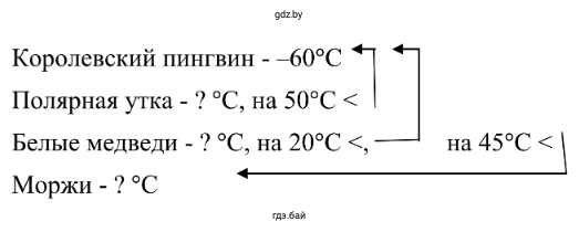 3. Королевский пингвин способен выдержать температуру до –60 °C . Самым морозоустойчивым животным в мире является полярная утка, которая может выдержать температуру на 50 °C ниже. Белые медведи выдерживают температуру на 20 °C ниже, чем пингвины, что на 45 °C ниже температуры, которую выдерживают моржи. Какие температуры выдерживают белые медведи, моржи и полярные утки?