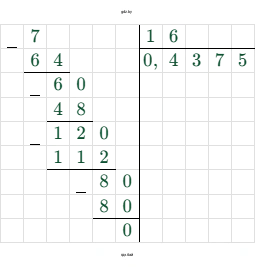 Чтобы представить обыкновенную дробь в виде десятичной, необходимо разделить ее числитель на знаменатель. Дробь $ \frac{7}{16} $ будет конечной десятичной дробью, так как её знаменатель $ 16 $ является степенью числа 2 ($ 16 = 2^4 $), и в его разложении на простые множители отсутствуют числа, отличные от 2 и 5.