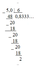 При делении мы видим, что остаток 2 начинает повторяться. Это означает, что в частном будет бесконечно повторяться цифра 3. Повторяющаяся цифра (или группа цифр) называется периодом и при записи числа заключается в скобки.