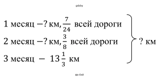 6.122. За первый месяц было построено 724 всей дороги от туристической базы до шоссе, за второй месяц – 38 всей дороги, а за третий месяц – остальные 1313 км. Какой длины построенная дорога?