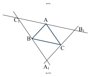 Ответ: Длина каждой стороны нового треугольника $A_1B_1C_1$ ровно в два раза больше длины соответствующей (параллельной ей) стороны исходного треугольника $ABC$. То есть: $A_1B_1 = 2 \cdot AB$, $B_1C_1 = 2 \cdot BC$ и $A_1C_1 = 2 \cdot AC$.