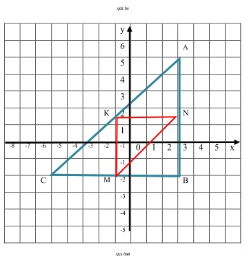 Ответ: Координаты середин сторон: K(-1; 1.5), M(-1; -2), N(3; 1.5). Длины сторон треугольника KMN пропорциональны длинам сторон треугольника ABC, так как отношения соответствующих сторон равны $\frac{1}{2}$: $\frac{NK}{BC} = \frac{KM}{AB} = \frac{MN}{AC} = \frac{1}{2}$.
