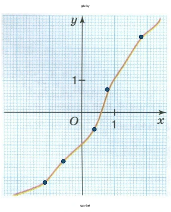 а) Чтобы отметить на линии точки с заданной ординатой (координатой $y$), необходимо для каждого значения $y$ найти соответствующую ему абсциссу ($x$). Для этого находим на оси ординат ($y$) заданное значение, проводим от него горизонтальную линию до пересечения с графиком функции, а затем из точки пересечения опускаем перпендикуляр на ось абсцисс ($x$), чтобы определить её значение.Масштаб графика: 1 большая клетка на осях соответствует 1 единице. Каждая большая клетка разделена на 5 маленьких, значит, цена одного маленького деления составляет $1 / 5 = 0,2$ единицы.