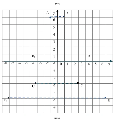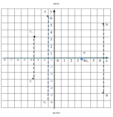 - Для точки $D(4; 0)$ симметричной будет точка $D_1(-4; -0)$, то есть $D_1(-4; 0)$.