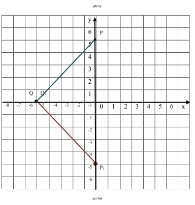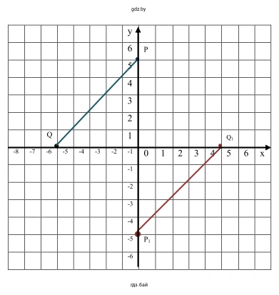Для решения задачи сначала определим координаты исходных точек: $P(0; 5)$ и $Q(-5; 0)$. Чтобы построить отрезок, симметричный данному, нужно найти координаты его концов, которые симметричны концам исходного отрезка, и соединить их.