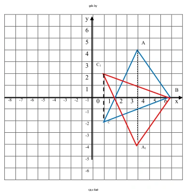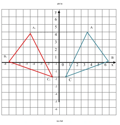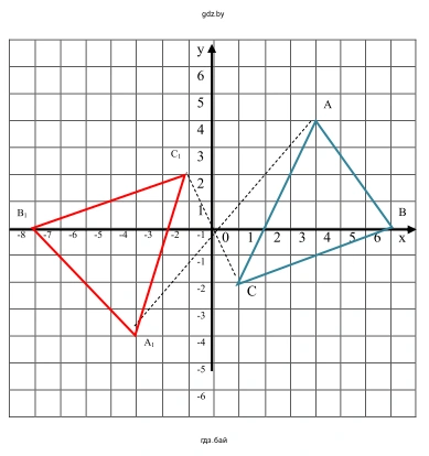 Ответ: Координаты вершин симметричного треугольника $A_1B_1C_1$ равны $A_1(-4; -4)$, $B_1(-7; 0)$ и $C_1(-1; 2)$.