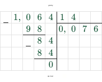 $0,01064 : (-0,14) = - (0,01064 : 0,14) = - (1,064 : 14) = -0,076$.