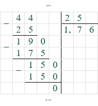 $44 : (-25) = -\frac{44}{25} = -\frac{44 \cdot 4}{25 \cdot 4} = -\frac{176}{100} = -1,76$.