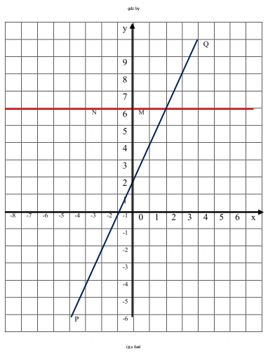 На рисунке видно, что прямая MN (синяя линия) и прямая PQ (зеленая линия) пересекаются в точке, которую мы обозначили буквой K. Чтобы определить ее координаты, спроецируем ее на оси координат. Проекция точки K на ось абсцисс (ось Ox) дает значение $x = 2$, а проекция на ось ординат (ось Oy) дает значение $y = 6$.