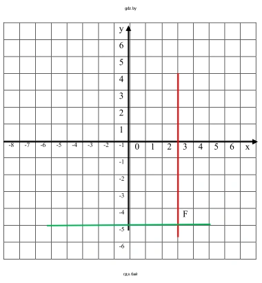 б) Прямая, параллельная оси ординат (оси $Oy$), является вертикальной прямой. У всех точек, лежащих на такой прямой, одинаковая абсцисса (координата $x$). Поскольку прямая проходит через точку $F(3; -5)$, то абсцисса всех точек на этой прямой равна $3$. Уравнение этой прямой имеет вид $x = 3$. Чтобы записать координаты какой-нибудь другой точки, лежащей на этой прямой, нужно выбрать любое значение ординаты $y$, отличное от $-5$, при этом абсцисса должна оставаться равной $3$. Например, возьмем $y = 0$. Тогда координаты точки будут $(3; 0)$.