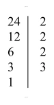 $24 = 2 \cdot 12 = 2 \cdot 2 \cdot 6 = 2 \cdot 2 \cdot 2 \cdot 3 = 2^3 \cdot 3^1$