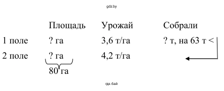 П.37. Площадь двух полей, засеянных подсолнечником, равна 80 га. На одном поле с каждого гектара собрали 3,6 т семян, а на другом − 4,2 т. Найдите площадь каждого поля, если с первого поля собрали на 63 т меньше, чем со второго.