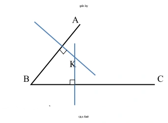 В результате этих построений образуется четырехугольник $PBQK$. По построению, углы $∠KPB$ и $∠KQB$ являются прямыми, то есть $∠KPB = 90°$ и $∠KQB = 90°$. Угол, образованный перпендикулярами, — это $∠PKQ$, который мы обозначим как $∠K$. Исходный угол — это $∠ABC$, который мы обозначим как $∠B$.