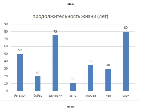 П.7. Постройте столбчатую диаграмму максимальной продолжительности жизни некоторых животных по следующим данным: бегемот − 50 лет, бобёр − 20 лет, дельфин − 75 лет, заяц − 11 лет, корова − 35 лет, лев − 30 лет, слон − 80 лет.